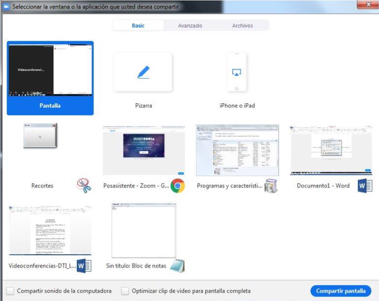 Haga clic en el botón “Compartir pantalla”, seleccione cual ventana desea compartir y haga clic en el botón “Compartir pantalla»